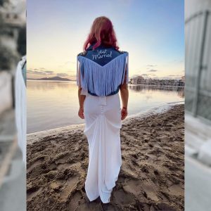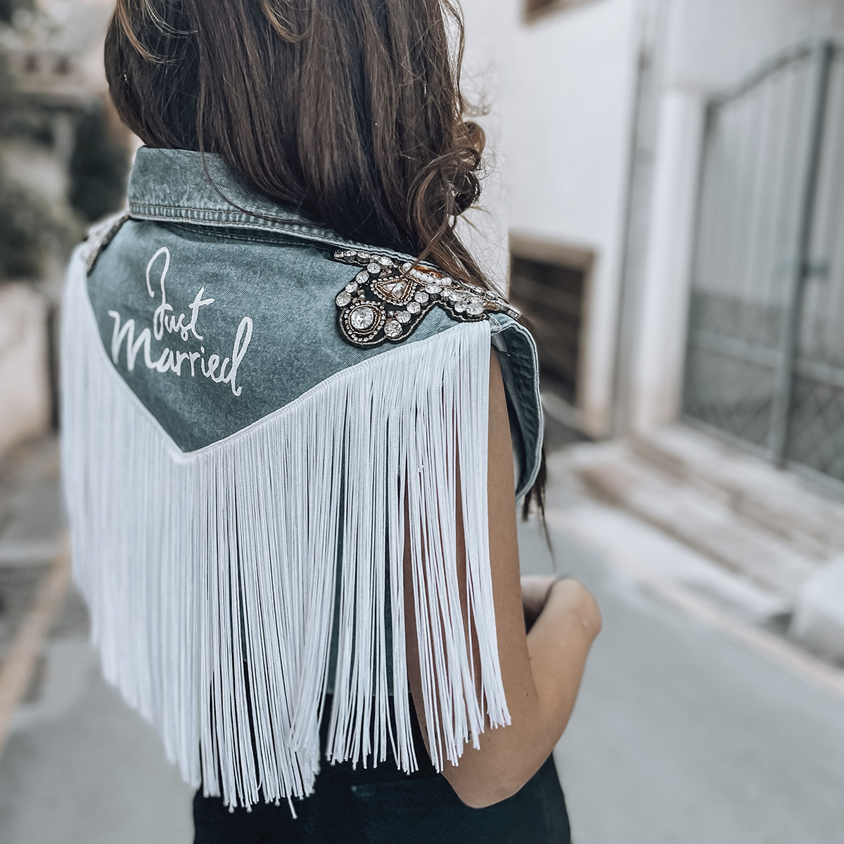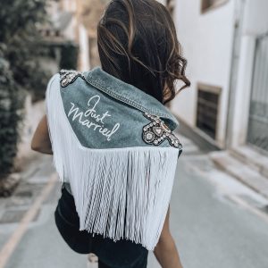Chaleco vaquero con apliques de cruces de pedrería en los hombros, hombreras y fleco blanco. Llevá además el texto “Just Married” si es para el día de tu boda! Pero puedes escribir lo que quieras!