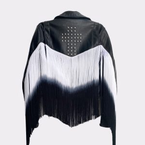 Chaqueta de poli-piel negra personalizada con fleco y tachuelas.