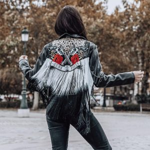 Chaqueta personalizada con tela de pelo de leopardo, parche de hilo del grupo Guns N’ Roses y fleco de seda degradado.