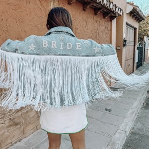 Hecha a partir de una base vaquera de alta calidad, esta prenda destaca por su espectacular fleco de seda de 40 cm, con caída elegante y movimiento fluido — sin enredos y con un acabado ligero que acompaña cada paso y cada baile. En la espalda, la palabra “BRIDE” cobra protagonismo a través de parches bordados con perlas y destellos, un detalle sofisticado que aporta un toque de luz y glamour a tu outfit nupcial.