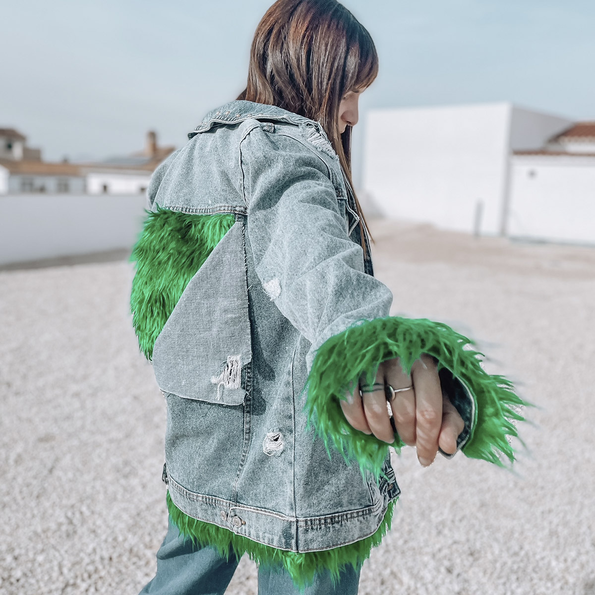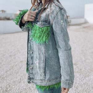 Chaqueta personalizada con telas interiores que asoman de forma aleatoria por diferentes lados de la chaqueta, puedes elegir que tipo de tela quieres que se vea, esta es nuestra idea! ¡Pelo verde!