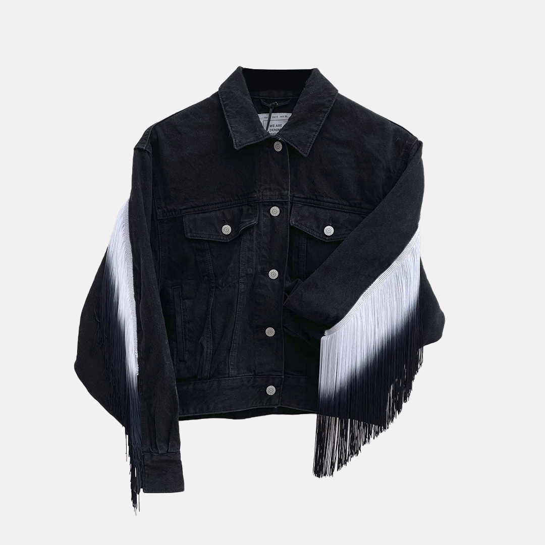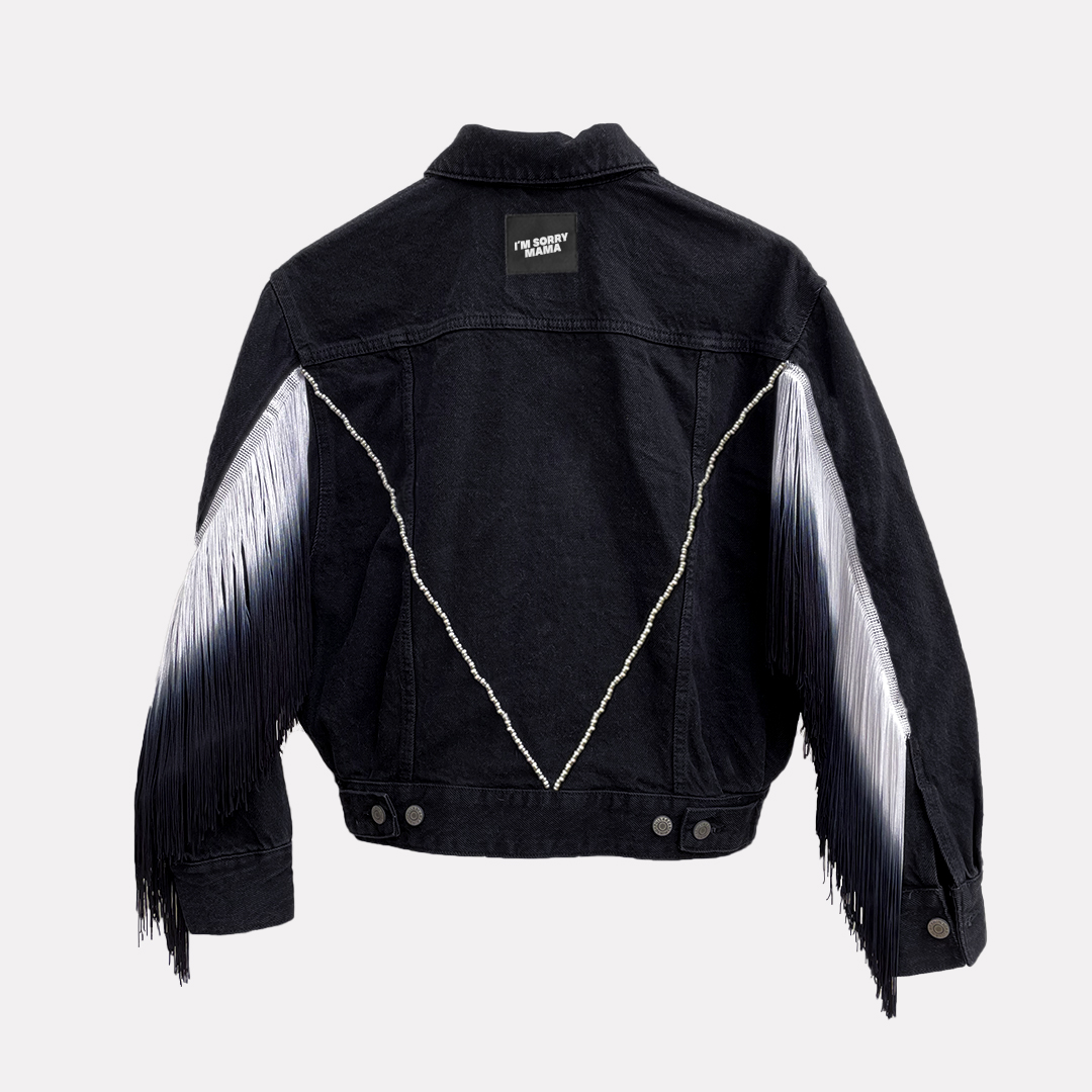 Tiene en toda la manga unos preciosos flecos en degradado y una V en la espalda bordada a mano con cuentas plateadas y color blanco nacar. Puedes personalizar la tuya con los colores que quieras.