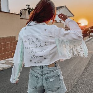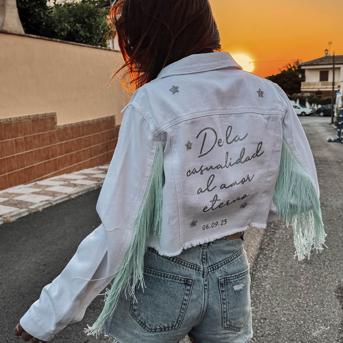 Haz que tu gran día sea inolvidable con esta chaqueta novia personalizada, diseñada para reflejar tu esencia en cada detalle. La base blanca —sujeta a disponibilidad— sirve como lienzo para un diseño exclusivo con texto pintado a mano en cursiva en la espalda y elegantes flecos de 15 cm en las mangas en el color que tú elijas.