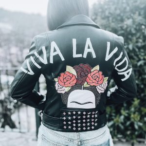 Chaqueta personalizada con parche de hilo y telas, muchas tachuelas de estrellas y piedras en tonos claros y mensaje pintado a mano.