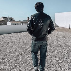 Chaqueta personalizada de chico con tachuelas formando un rayo en la espalda!