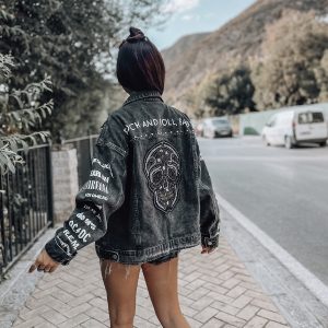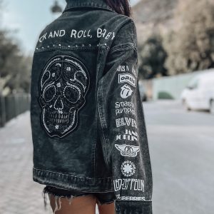 Chaqueta negra vaquera estilo rock con calavera y detalles personalizados