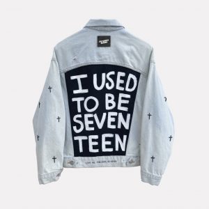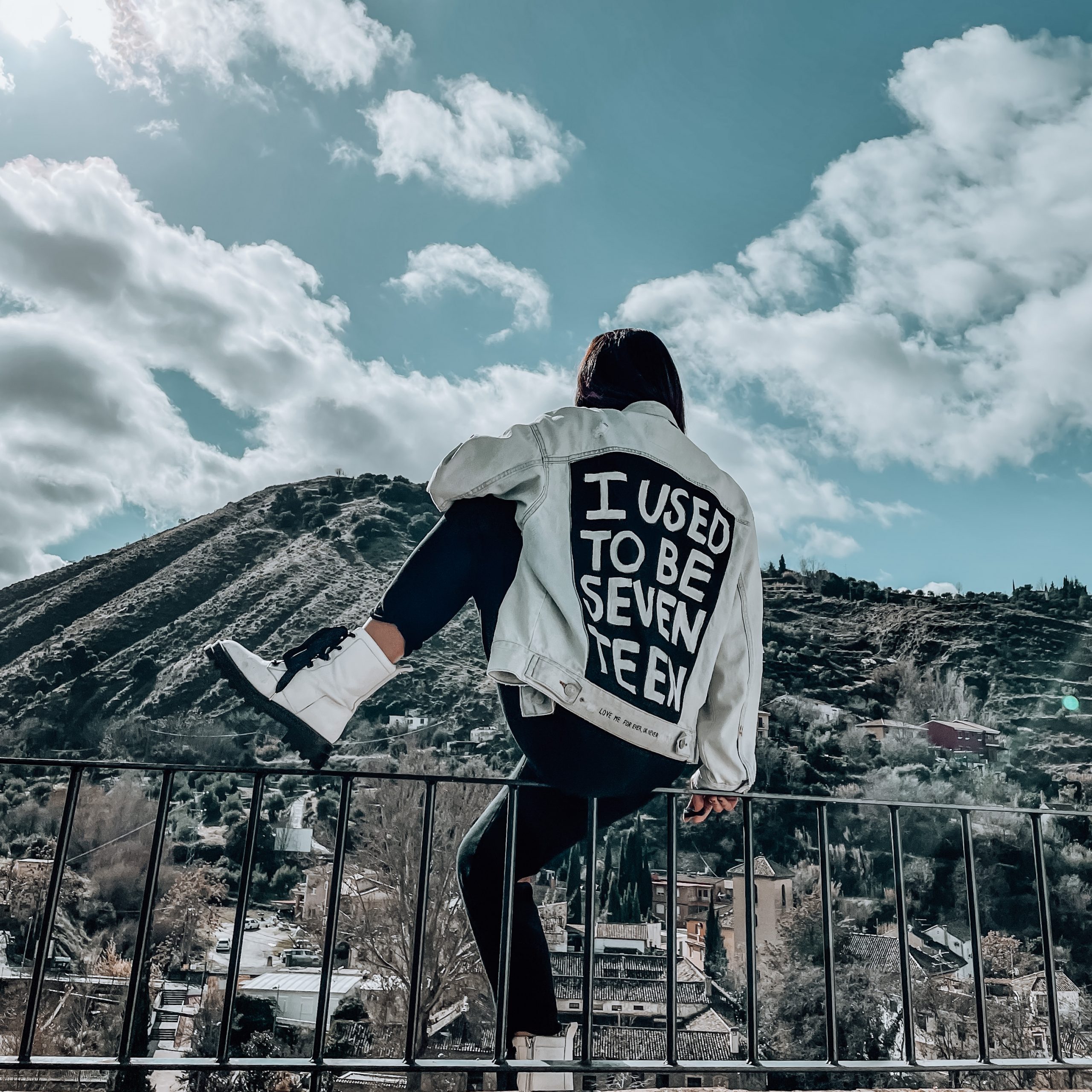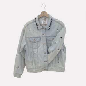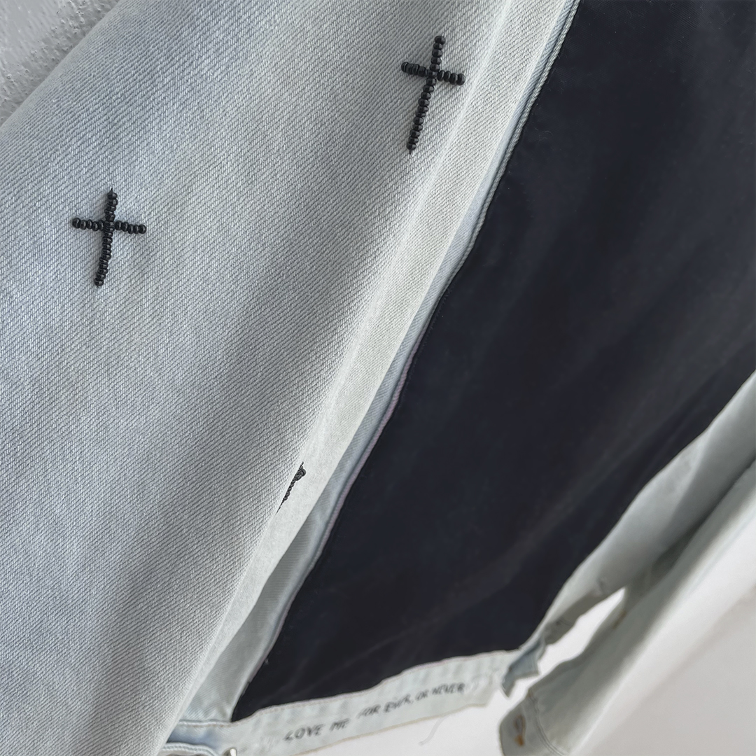 Bordada a mano con mostacillas negras formando cruces en las mangas. La espalda está forrada con tela de algodón negra. ¡Con pintura textil puedes poner la frase que quieras!