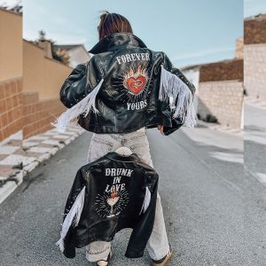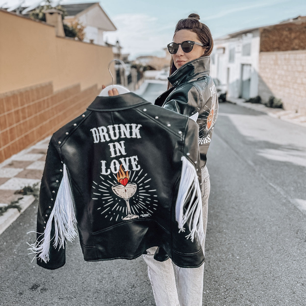 Si buscas una chaqueta de novia alternativa o simplemente una prenda con actitud para marcar estilo, esta chaqueta negra de polipiel con flecos de seda y tachuelas es lo que necesitas. Con un diseño exclusivo estilo rock vintage en la espalda que podremos diseñar juntxs, cada pieza es una declaración de personalidad.